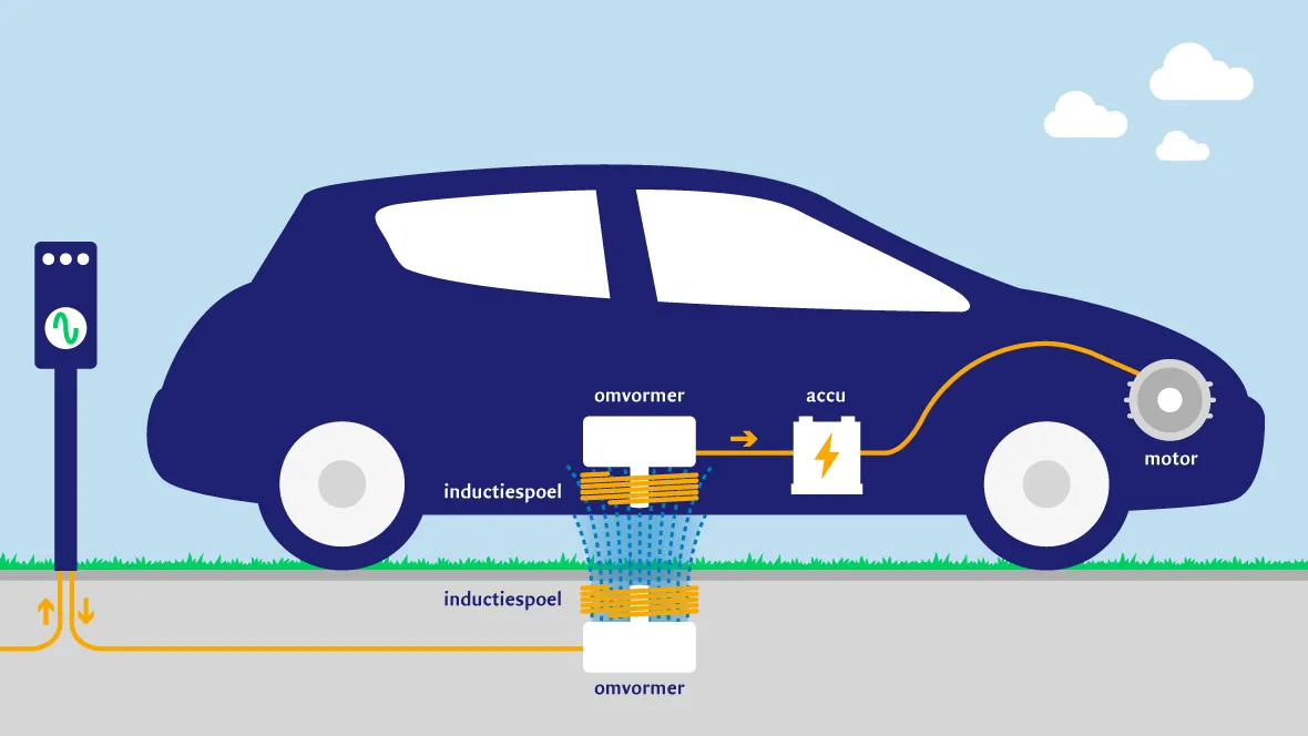 Het draadloos opladen van een elektrische auto via inductie. Het magneetveld is het sterkst tussen de inductiespoelen.