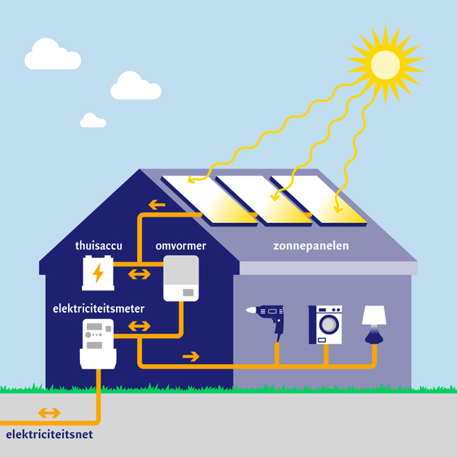 Figuur: Werking van een thuisbatterij in combinatie met zonnepanelen