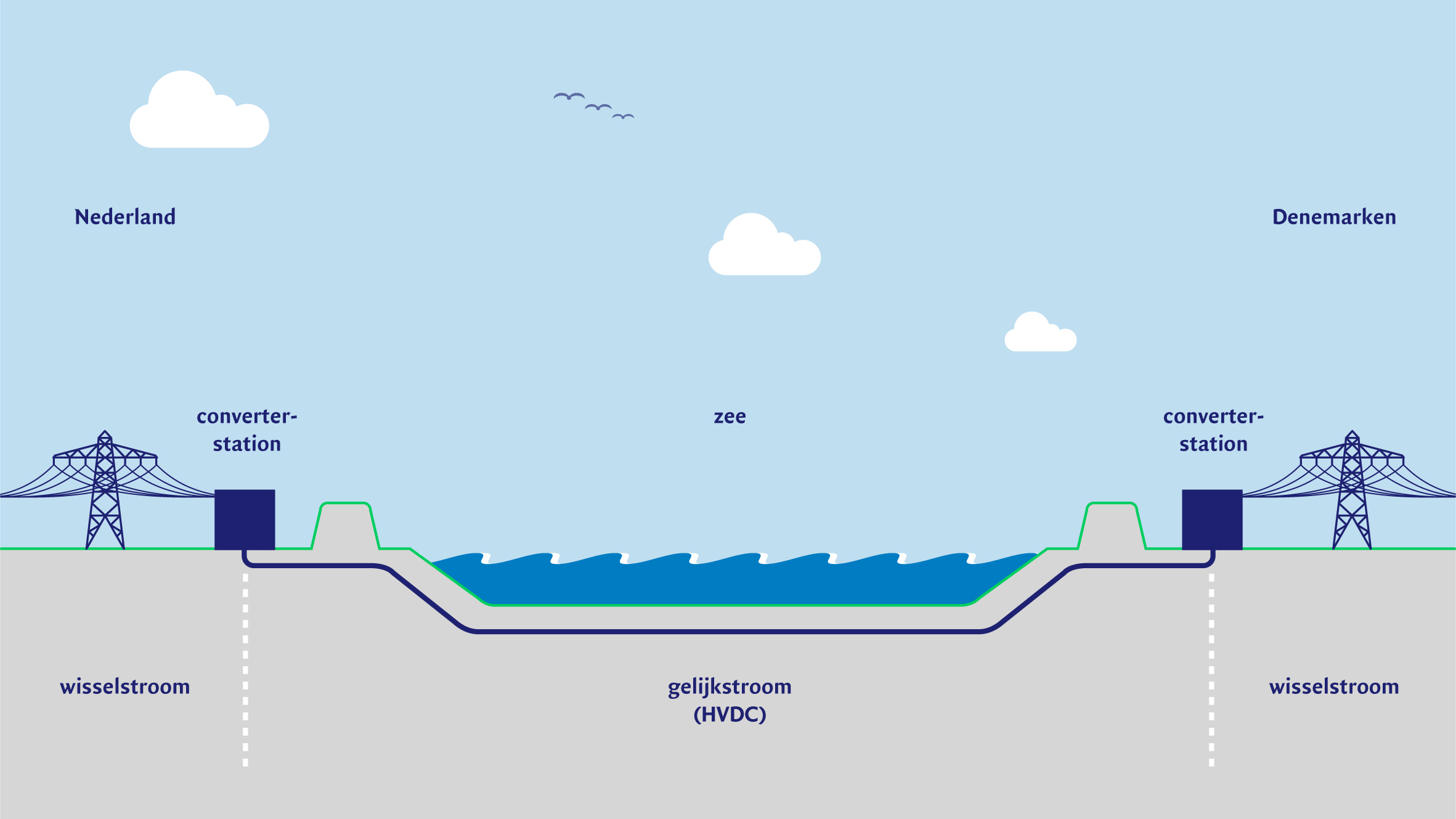 Voorbeeld van een gelijkstroom hoogspanningsverbinding (HVDC) onder de zee. In converterstations wordt wisselstroom omgezet in gelijkstroom of omgekeerd.