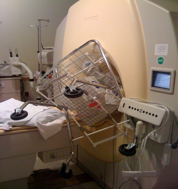Voorbeeld van aantrekking door de magneet: ziekenhuiskarretje in een MRI (Bron: NVMBR/Philips)