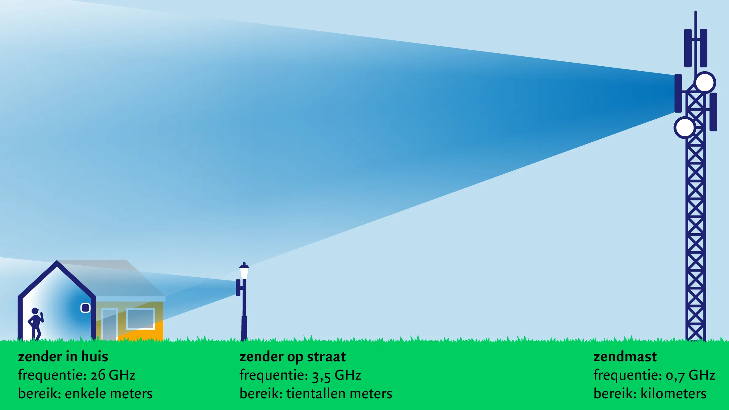 Weergave hoe een 5G netwerk eruit zou kunnen gaan zien. Zendmasten met frequenties rond 0,7 gigahertz zorgen voor basiscommunicatie op lange afstand. Zenders op straat met frequenties rond 3,5 gigahertz zorgen voor snelle communicatie bij meer dataverkeer (vergelijkbaar met huidige wifi-routers). Zenders in of aan woningen met frequenties rond 26 gigahertz zorgen voor zeer snelle communicatie van grote hoeveelheden data, dicht bij de gebruiker.