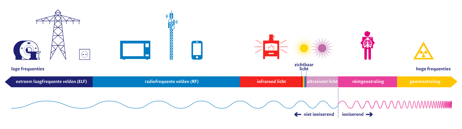 Bij nog hogere frequenties spreken we over ioniserende straling of kortweg straling. Het gaat dan bijvoorbeeld om röntgenstraling of straling van radioactieve stoffen. De straling wordt ioniserend genoemd omdat de straling zoveel energie bevat dat ze een elektron uit atomen kan wegslaan. Hierdoor krijgt het atoom een positieve lading en wordt het een ion. Op deze wijze kan ioniserende straling het DNA van lichaamscellen beschadigen. Schade aan het DNA kan kanker veroorzaken. Alle elektromagnetische velden met lagere frequenties dan die van de ioniserende straling hebben deze ioniserende eigenschap niet en worden daarom ook wel niet-ioniserende straling genoemd.Waarom gebruikt het Kennisplatform het woord ‘straling’?